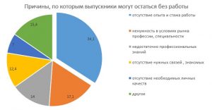 По данным нашего исследования, 65,5% студентов не испытывают сильного беспокойства остаться без работы после окончания вуза и только 7,4% испытывают сильное беспокойство. Среди причин того, что выпускники могут остаться без работы на первом месте, является — отсутствие опыта и стажа работы 34,1%.