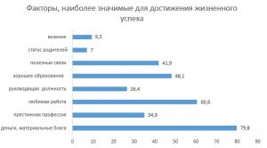 Изучение представлений молодых людей об успехе в жизни (индикатор их ценностных ориентаций) показывает, что в числе наиболее значимых ценностей являются деньги, материальные блага (79,8%) и любимая работа (60,5%).