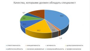 Для того, чтобы устроиться на желаемую работу, по мнению студентов, необходимо обладать, прежде всего, следующими личностными качествами: ответственностью (40,5%), целеустремленностью 16,2%, профессионализмом (14,2%).
