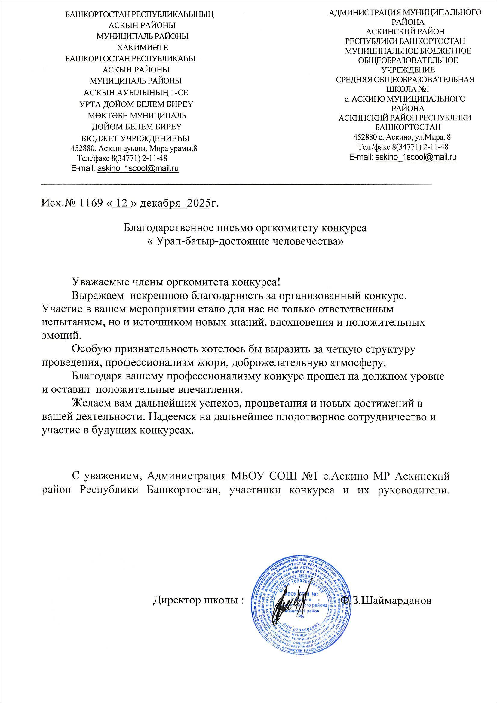Благодарственные письма организаторам конкурса «Башкирский народный эпос «Урал-Батыр» – достояние человечества» от администрации МБОУ СОШ № 1 с. Аскино Республики Башкортостан: